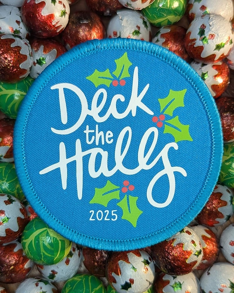 This turquoise patch features "Deck the Halls" text and holly adornments in addition to the year 2025.