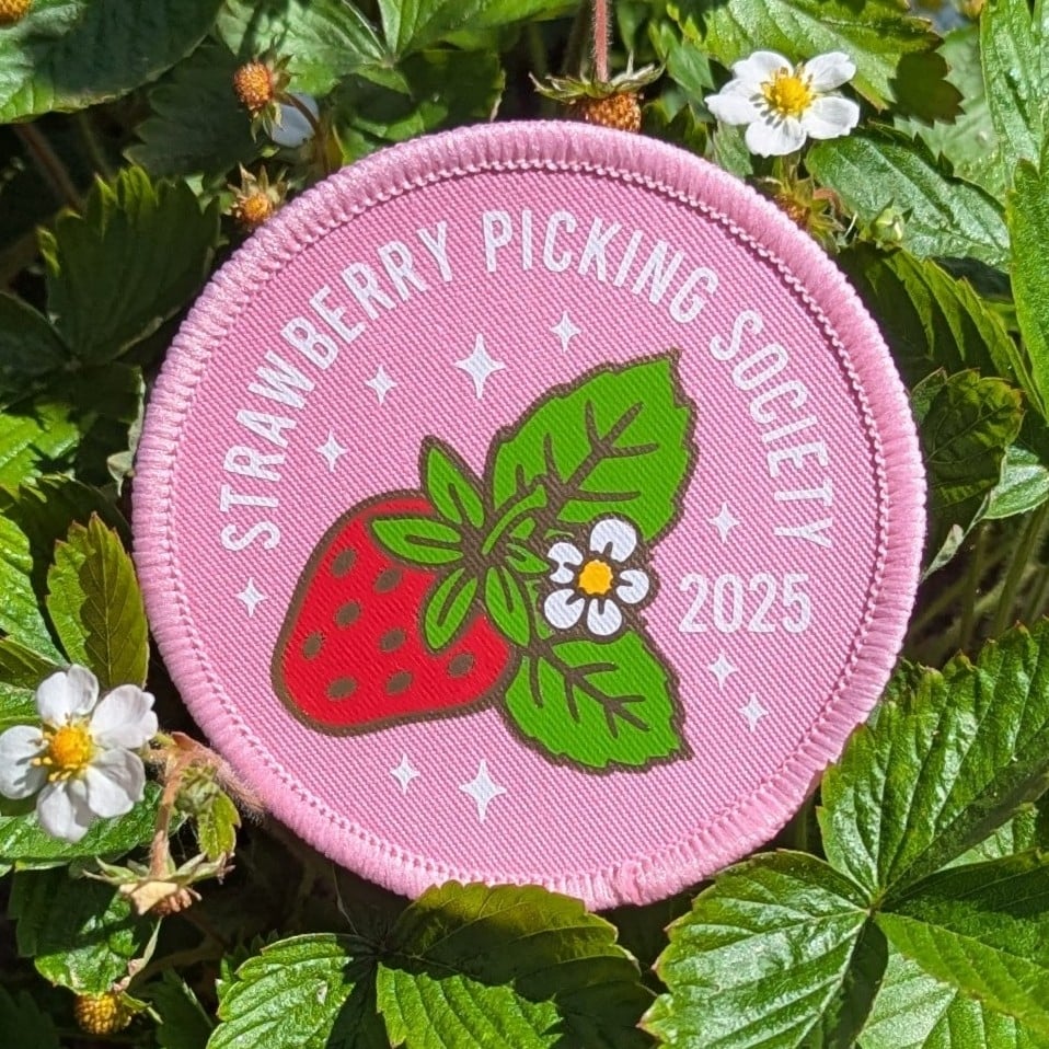 This pink patch with a juicy red strawberry and tiny white flower, highlighted in gold is for the strawberry pickers, eaters and lovers out there!
