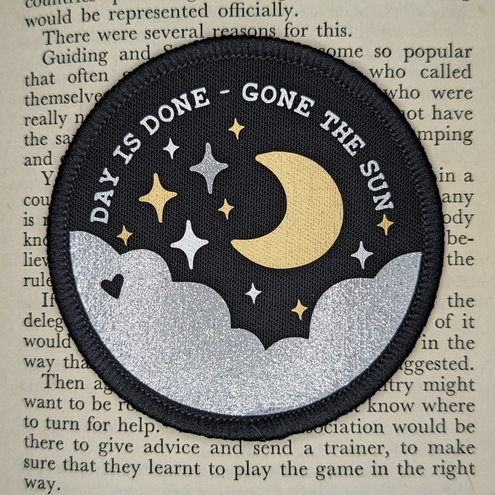 This patch with metallic and glittery print is another to add to the campfire songbook series and along with it's daytime friend is probably the most important one out there!