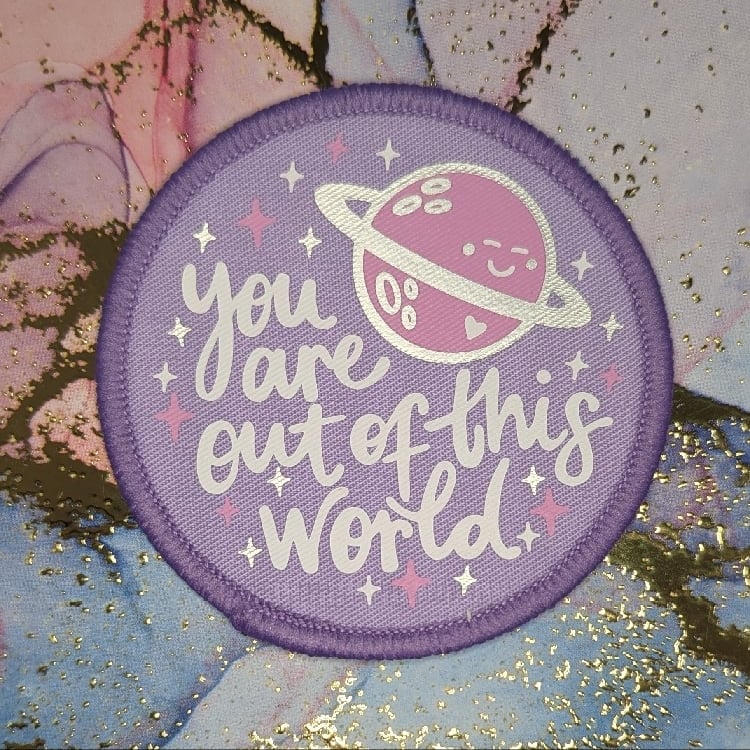 This patch is a perfect gift for someone that means the world to you, with it's cute little planet "you're out of the world" message and metallic sparkles it's sure to make someone's day.